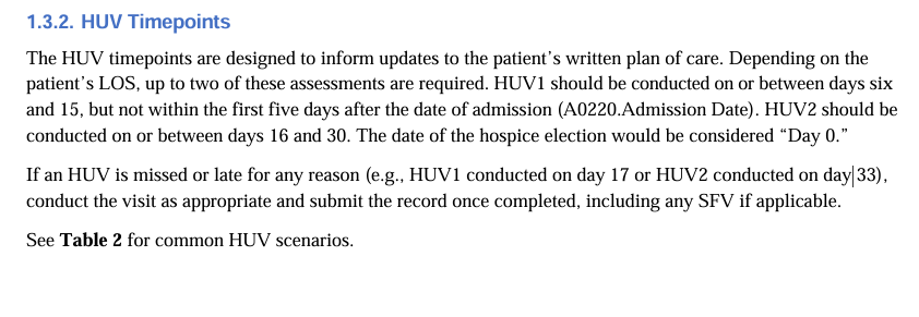 Hello! We had a patient transfer from another hospice agency on day 18 of the election of their first hospice benefite period. Since it was a transfer, the continue in that benefit period. We are confused on how to schedule the HOPE visits (specifically HUV1 and 2). Should they be scheduled based on the ELECTION DAY (18 days before our agency admitted them) or on the ADMISSION DATE (day 18 of the first benefit period). Reading the Hope Guidence manual, it feels like these are used interchangable (see example below from page 14). Any clarification would be appreciated. Thanks so much!