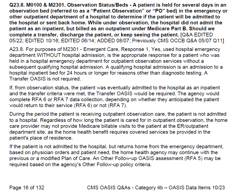 We currently have two claims from Humana where they are downgrading the HIPPS Codes on patients because the nurses answered M0100 (3)- Resumption of care (after inpatient stay). In each case, the hospital classified the stay as "Observation." One was a 2-day stay and the other, 3-day. The explanation states that "[h]ospital observation and outpatient stays are not considered eligible for the institutional designation."