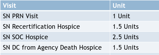 Up until last year, our program was combined home health and hospice, so we always modelled our hospice productivity on home health standards. We use a points model with different types of visits being worth different amounts. Our expectation is that a coworker should be able to complete 4-6 units/points in an 8 hour shift.